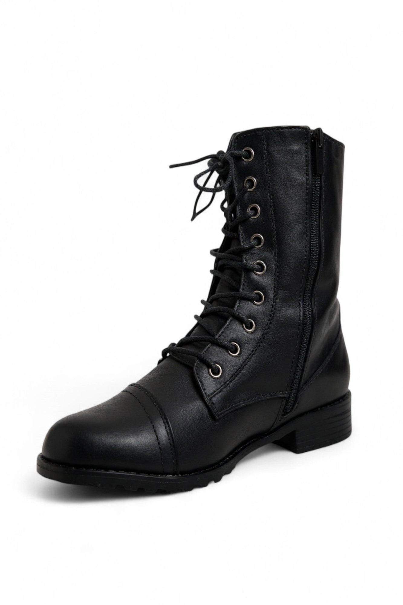This is a black lace-up combat-style boot made of smooth synthetic leather. It features a mid-calf height with a rounded toe and a stitched cap-toe design. The upper has metal eyelets for the laces, which are tied at the top in a bow. The boot has a low, block heel and a durable rubber outsole with a ridged tread for better grip. The sleek, minimalist design gives it a versatile look suitable for casual, edgy, or utilitarian fashion styles.