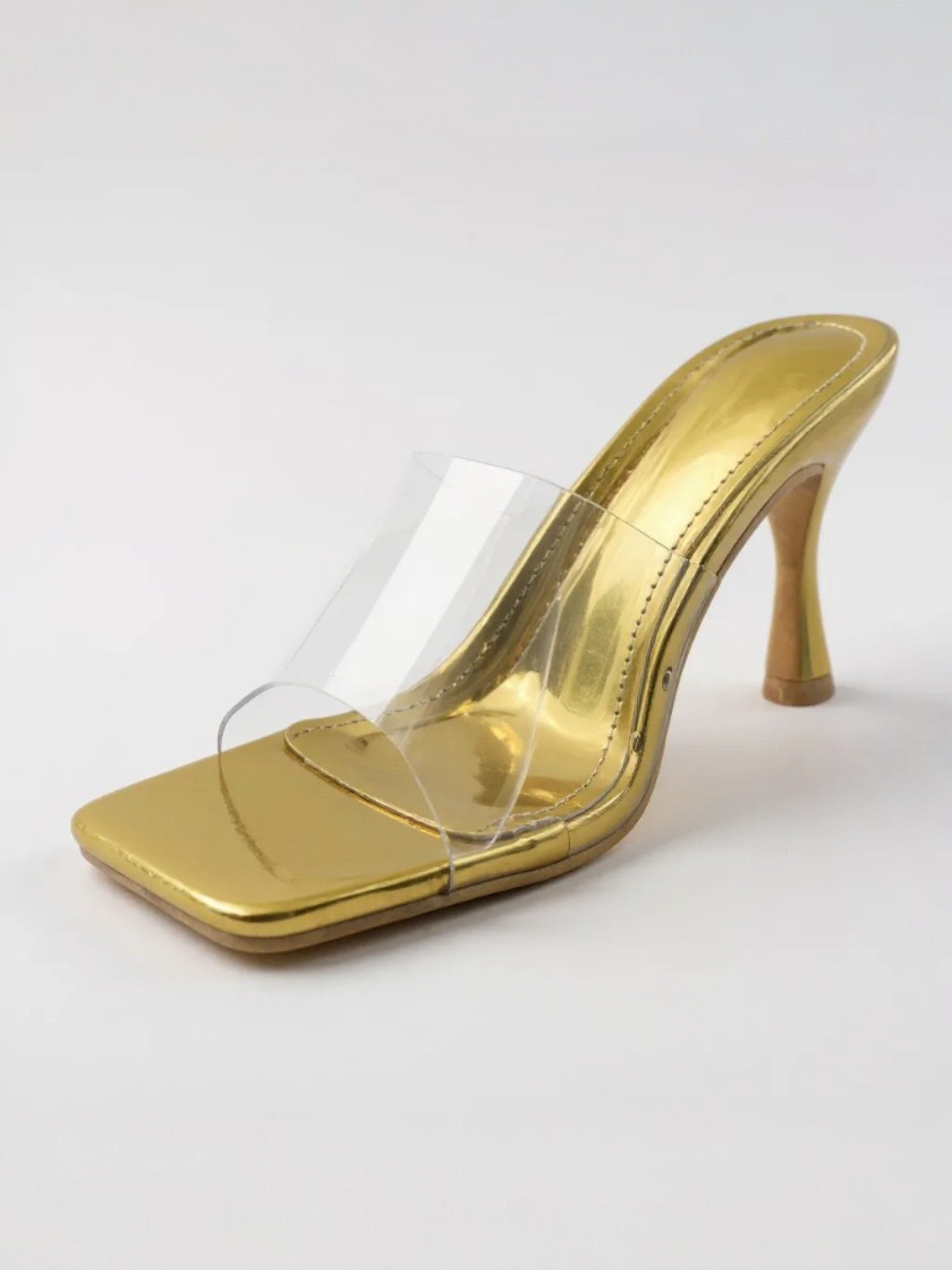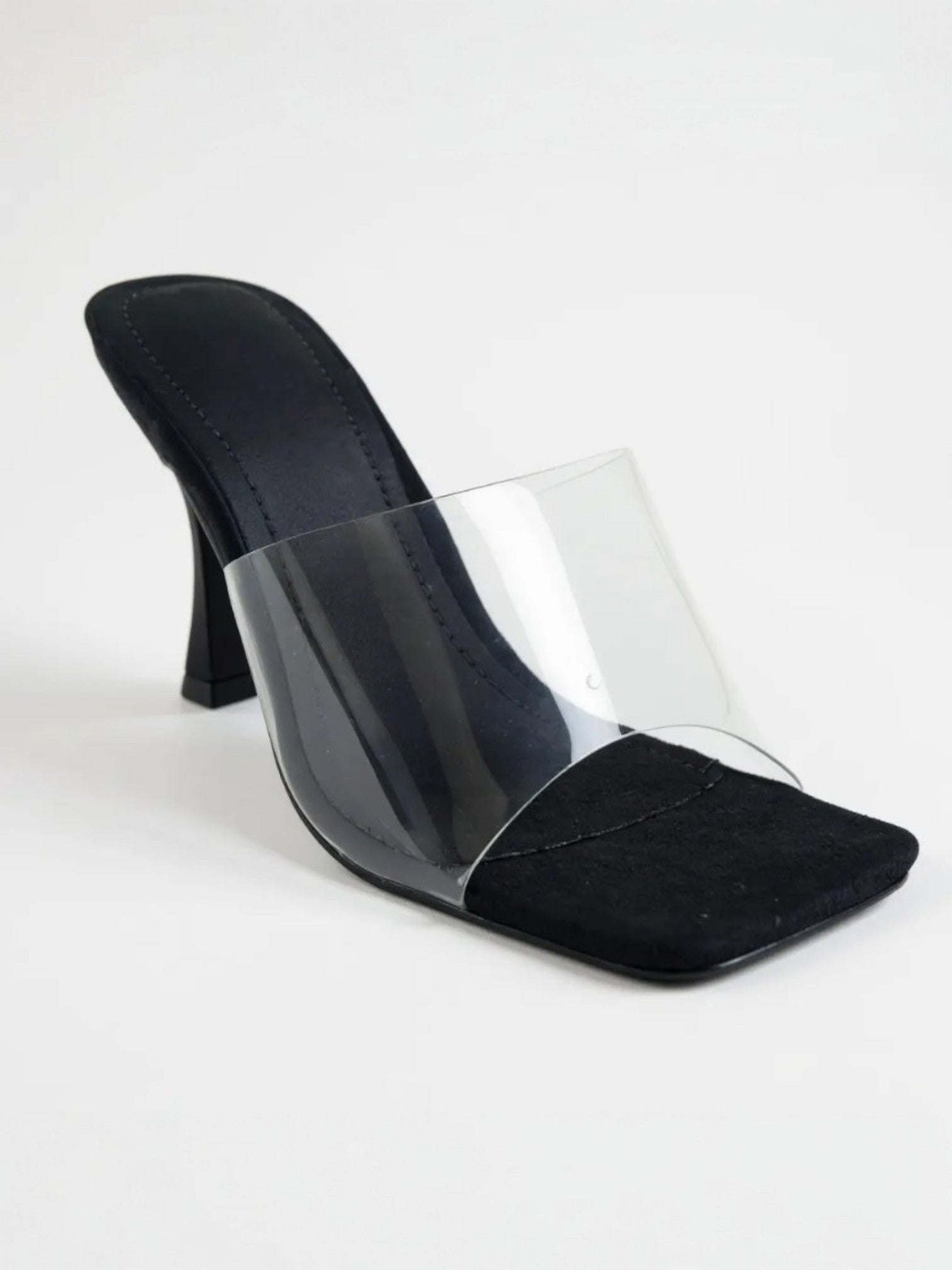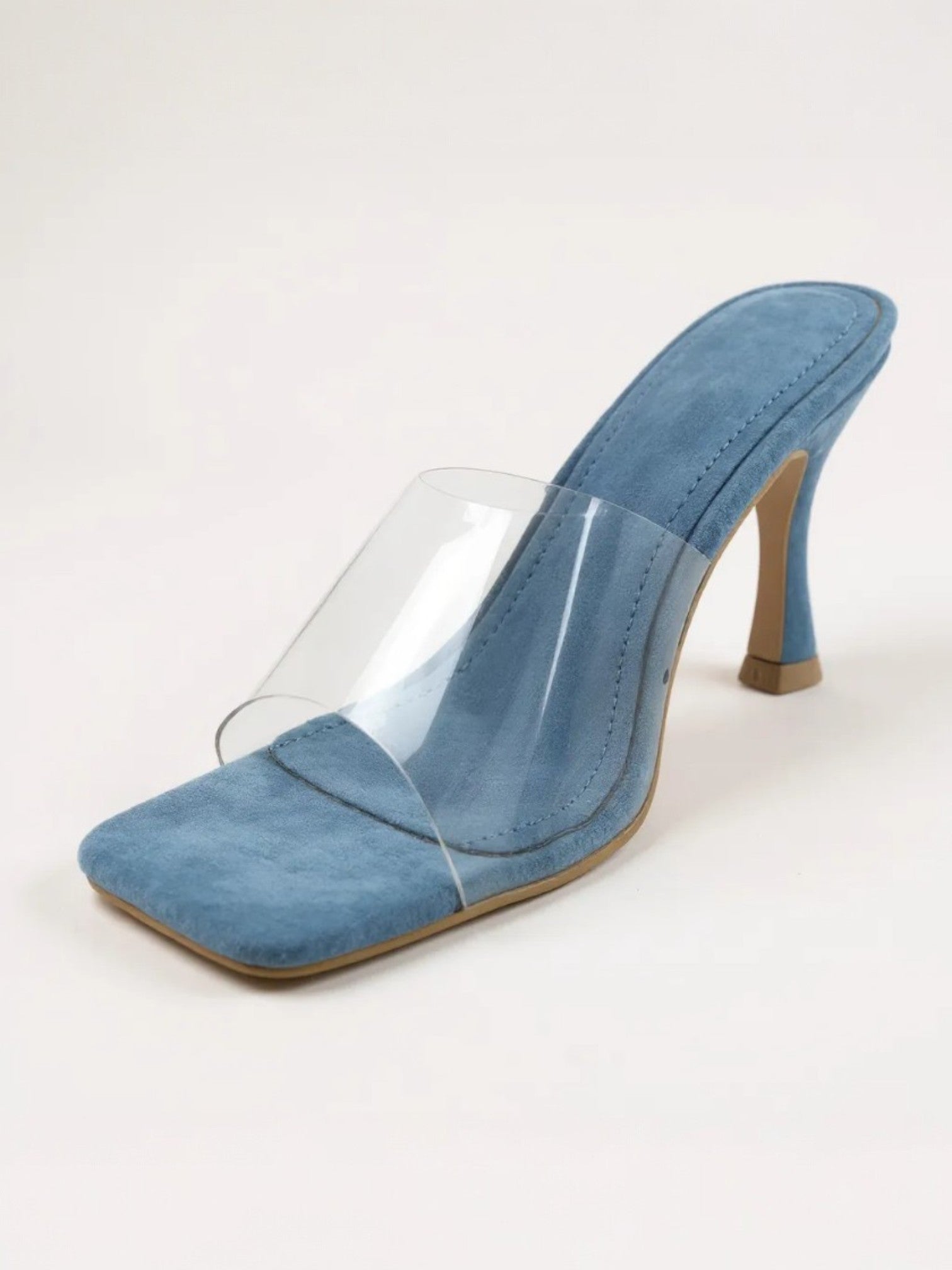 This is a bold mule with a contemporary twist. It features a 4 inches high stiletto heel and a square-toe design for a striking silhouette. The upper part combines a smooth suede (except white and gold) base with a transparent plastic overlay, adding a modern, futuristic touch. Ideal for making a fashion statement at evening events or stylish outings.