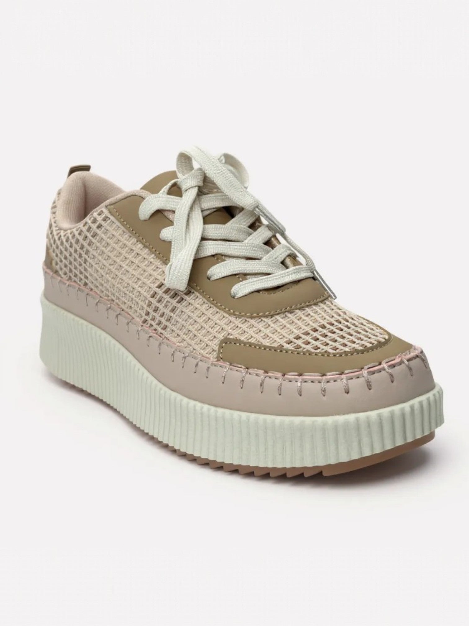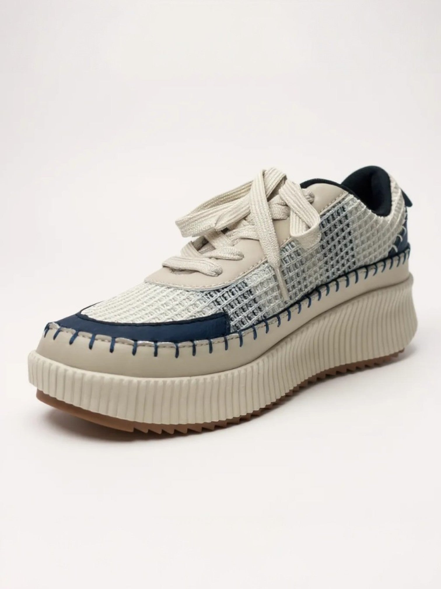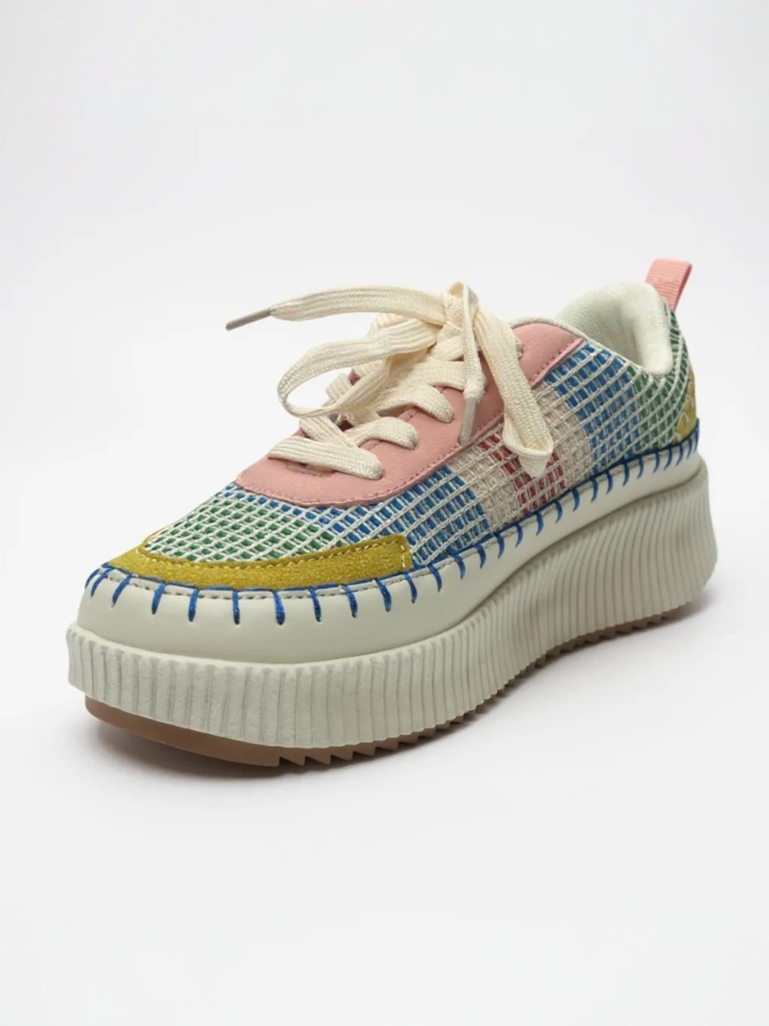 These sneakers feature a mixed color palette . They have a breathable mesh upper with a woven texture, complemented by a sturdy faux leather overlay. The shoes are designed with a chunky, ribbed platform sole for added height and comfort, and are secured with white lace-up ties. The hand-stitched detailing along the edges adds a unique, artisanal touch, making them a stylish yet practical choice for everyday wear.
