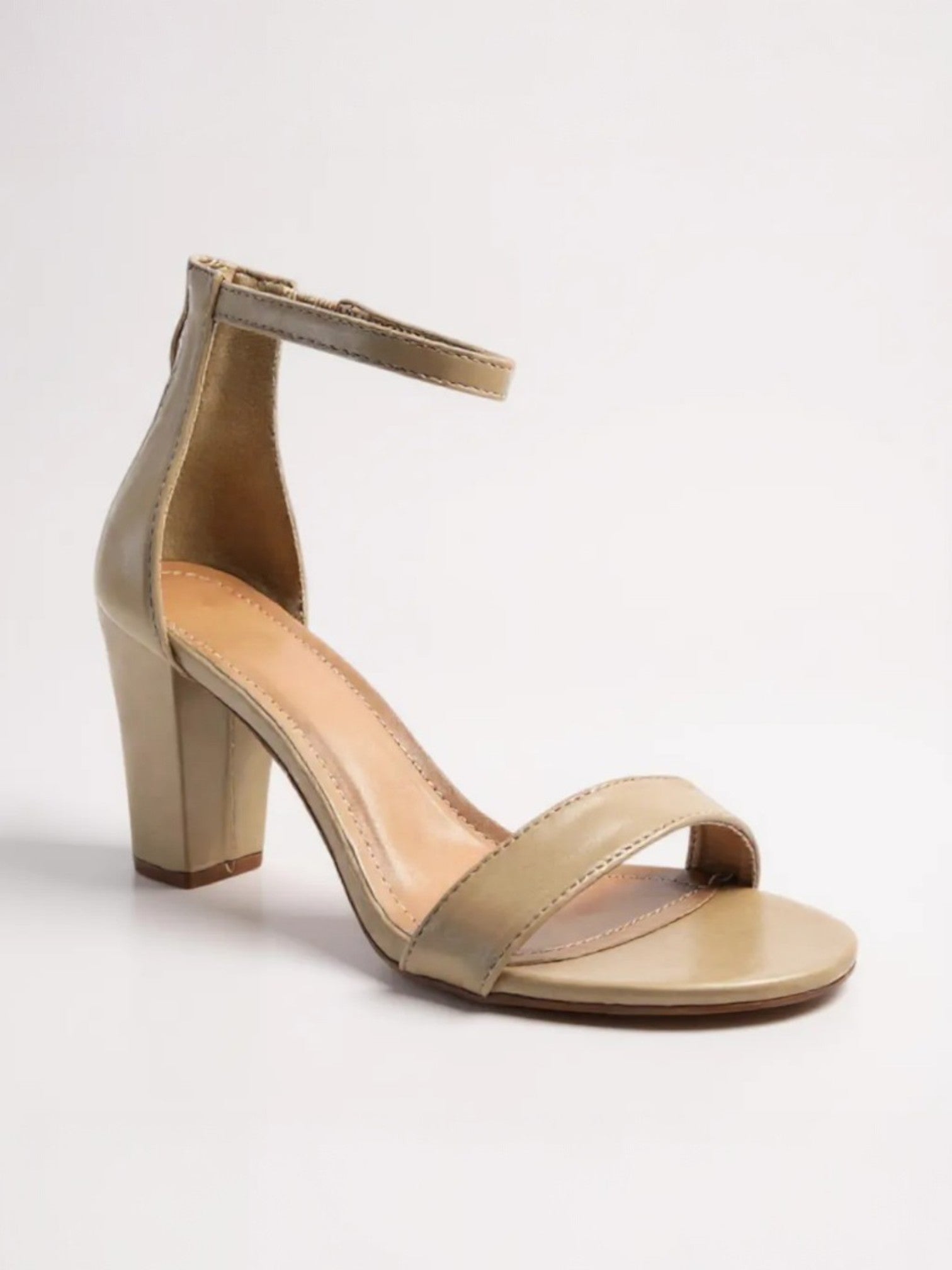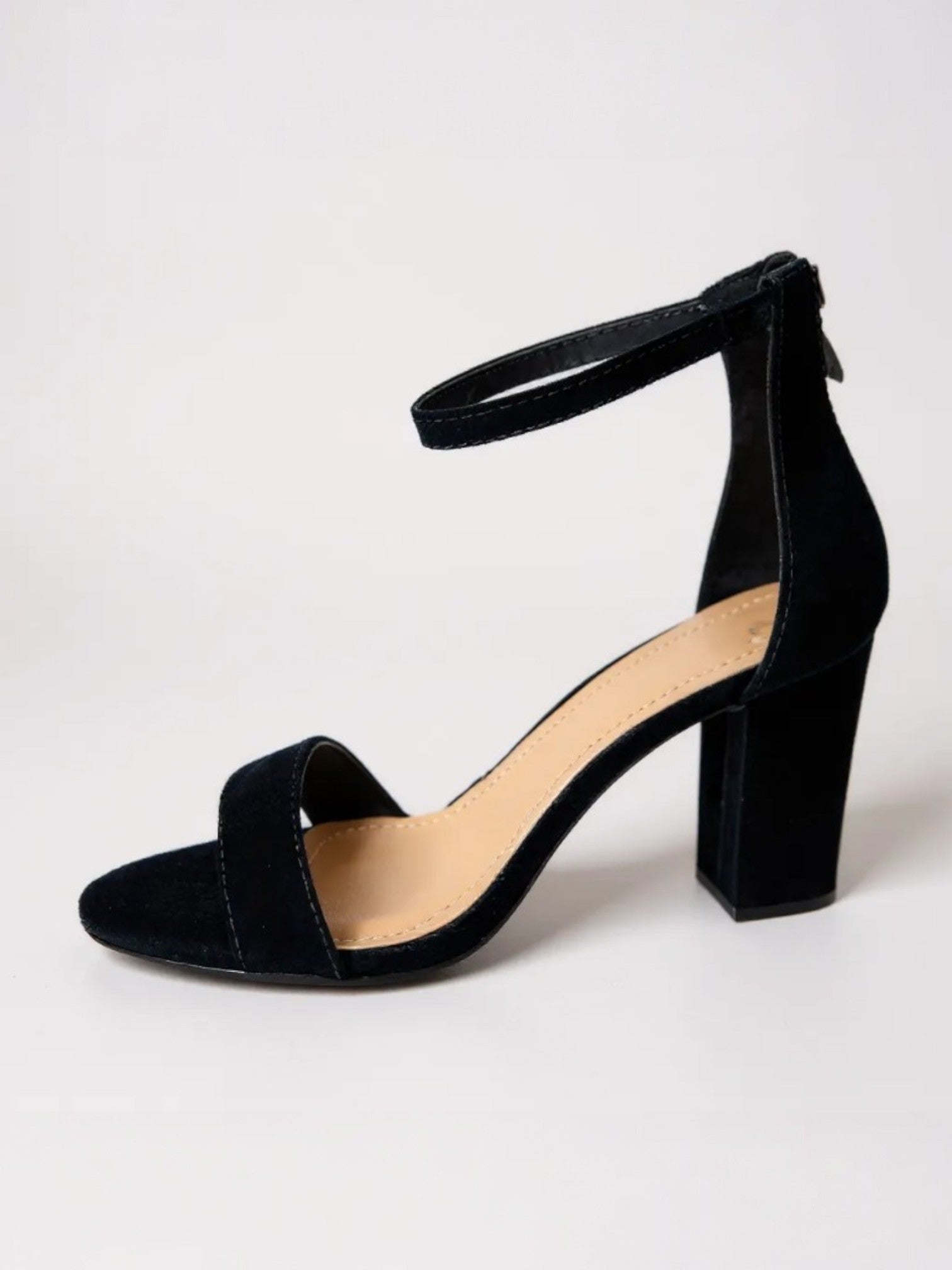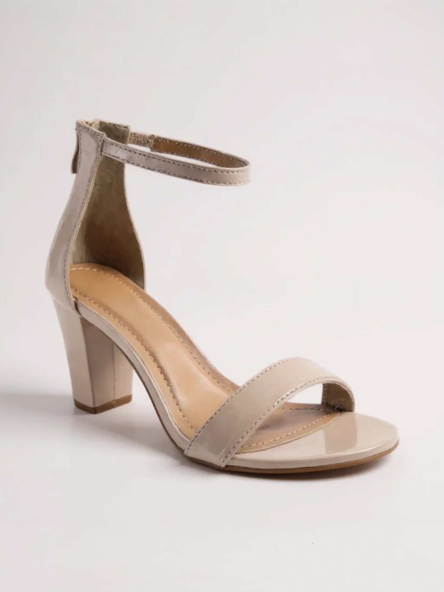 This is a sleek, open-toe sandal featuring a minimalist two-strap design. It has a single band across the toes and a slim ankle strap with a back zipper for a secure fit. The sandal is set on a mid-height block heel, providing both elegance and stability, making it ideal for dressy occasions or stylish everyday wear.